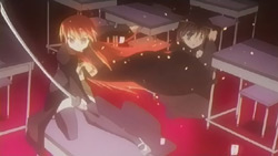 The animation this episode is alright. The fight between Marianne and Shana, followed by Friagne’s appearance is fairly pretty, but there is also the lack of detail that BluWacky pointed out. However, the plot still bores me. Maybe bores isn’t the right word. The plot doesn’t excite me. For all of the surprises that Yuuji pulls on Shana concerning the importance of life (trying to save people, allowing his own life-force to be used), they all feel fairly predictable for his type of character. And while Shana is quite cute eating melon bread, and serious while fighting and talking with Alastor about everything, it doesn’t feel like there’s much more to her character than that. They didn’t even show her rebuilding the school.
