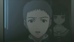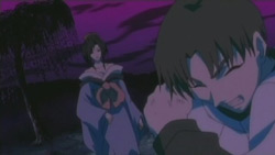 Hagi hands Saya the sword and she squares off against the Yokushu. As her own blood stains the blade, Saya cuts the monster in half, but then faints after she sees herself covered in blood.