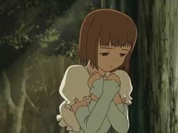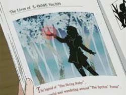 Arika wakes up in the infirmary, and Yohko tells her that since her nano-machines are acting weirdly, she’s probably sick. Yohko then asks Arika if she’s heard of the Enju no Kougyoku. Arika enlists her friends to research it, and they find a book that tells them about an Otome and the “Fire String Ruby.” Nina tells the story of the girl who was set to succeed the Fire String Ruby after she graduated. However, this girl fell in love, and the girl who had decided to become an Otome became troubled by her love or her dream. It had been decided that this girl would be one of the five pillars and usually these Otome who have no master serve the founder (Fumi-sama). For this girl, however, that was the most painful sentence. She who worried about her fate went into the forest of a god who could predict the future. But in the end, she never came back out. Thinking about the story afterwards, Arika sees Akane worrying to Nao about her situation. Akane is ready to tear her photo of Kazuya in half, but Arika stops her. After Akane asks Arika if she’s ever fallen in love (the answer is of course no), she tearfully recalls her feelings of love.