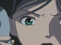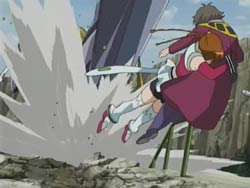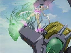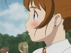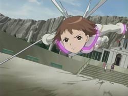 Meanwhile, Nagi and John Smith discuss what’s required to start the Harmonium, and it appears that they’re already using the data they stole on the Slaves. In fact, another crystal has been mailed out, this time to a street vendor right near where Akane has asked to meet Kazuya. She has decided to break it off and tells him that although she really loves him, she can’t throw away her dream. When she starts to run away, Kazuya chases her, and the two happen to run into Arika and Shizuru. But just then, a Slave appears and Akane asks Shizuru to let her fight. Shizuru agrees and activates Akane’s Pearl Robe, allowing Akane to fly into battle. Akane struggles at first, but with her resolve to be an Otome and will to fight for her dream, she manages to break off one of the Slave’s arms. A man in the crowd starts clutching his own arm and is quickly spotted by Shizuru. However, before Shizuru can do anything to him, he gets sniped by a hooded figure hiding in the surrounding mountains. His death and the breaking of the crystal also stop the battle. Akane bids a final farewell to a shocked Kazuya before flying off.