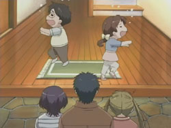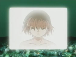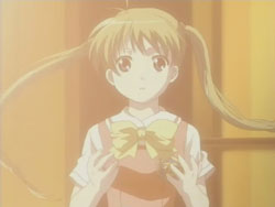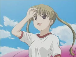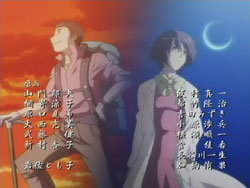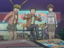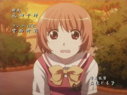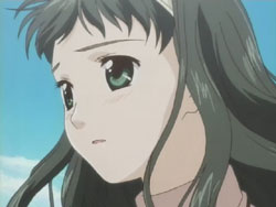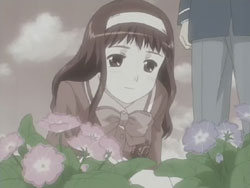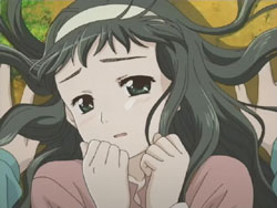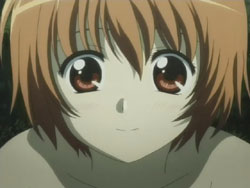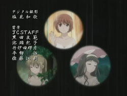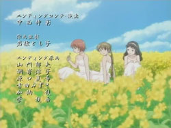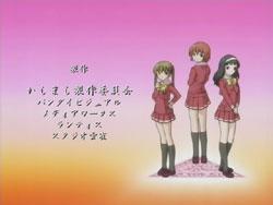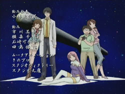 I’m very pleased with how the first episode of Kashimashi turned out as it’s pretty much everything I was hoping to see (and I’ve been waiting to see this since last fall). The general concept (boy gets hit on the head with a UFO and gets turned into a girl, shoujo-ai ensues) still gets to me in the I-can’t-believe-that’s-the-storyline sort of way, but I’ve really grown to like it thanks to the manga. The first episode gets a bit more sci-fi: there are a lot more spaceship and “Sora Hitoshi” shots than the manga. Other changes include the addition of the scene where Yasuna replants the primula flowers on the mountain and the addition of Yasuna when Hazumu is beamed down. They’re giving Yasuna a bit more screen time early on, but I don’t really mind because, as that final scene with the three girls shows, the focus of the series is still on the triangle relationship between Hazumu, Yasuna, and Tomari. And considering the future shot that they show in the very beginning, things are going to get interesting.