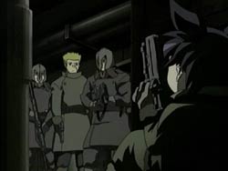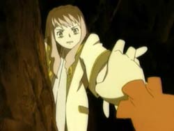 As the Jabal travels through the desert, Mikoto fails to claw her way into it. Midori, who doesn’t know that Arika and Mashiro were swallowed, decides to leave the two alone for now. For her, there’s a dangerous international situation to worry about. In the Airies Republic, Natsuki is being laughed at by Haruka and Yukino because of the hitchhiking incident. Turning serious, Natsuki requests Yukino and Airies’ cooperation, but gets turned down because of the current political atmosphere. In Windbloom, Sergay, who doesn’t know that it’s Rena in the capsule, is watching over the production of the new crystals. Nina pulls him out to ask him why he took over the Valkyrie unit, but Sergay tells her not to worry about it. When he calls her his cute daughter and uses the informal “Nina,” she asks that he use something that childish. Nina remembers when Sergay had found her after he had killed the people around her because of an orphan-related assassination plot. She had mis-fired her gun and the bullet had hit a pipe. The resulting shrapnel is what gave Sergay his scar. But at the time, he had stopped the soldiers from shooting her and took her in instead. As the current Nina grows more distant from her father, she finds herself wanting his attention more and more.