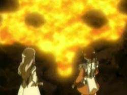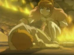 Inside the Jabal, Arika and Mashiro both blame themselves for what happened around them. Arika is taking it especially hard because she feels that she doesn’t understand anything and everything she does is a mistake. Mashiro reveals that Aoi is dead because of her. But at the same time, because of Aoi’s sacrifice, Mashiro has a will to live. However, Arika refuses to use her Otome powers, and she pushes Mashiro away when Mashiro tries to force a robe activation kiss. Suddenly, the Jabal’s stomach begins to fill with a lava-like digestive fluid. The girls attempt to cling onto a rocky pillar, but it breaks under pressure. In mid-air, Mashiro activates Arika’s Robe and Arika smashes her way out of the creature. The girls manage to laugh about their appearance afterwards and even briefly get to enjoy the sunrise. It is brief because Arika soon notices a plume of smoke in the direction of the Aswad village.