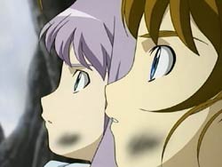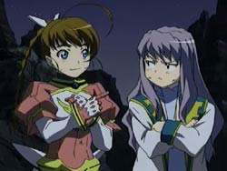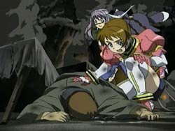 The two arrive to find bodies on the ground and flames everywhere. They catch Fia Gros (of Cardair) stealing the Aswad’s research – the REM data. Arika challenges how the enemy Otome’s follows of her master’s orders, but Fia Gros replies that she would of course do whatever her master wanted because their lives are bound to each other. She then knocks Arika out of the way and disappears. Arika’s attention then turns saving the people around her. Mashiro, on the other hand, isn’t really sure of what to do and tries to help the best she can. After Arika has saved a boy from the fire, Midori and the cyborg arrive back in the village. Midori switches into leader mode and unites her people to get through the ordeal. As everyone gets to work, Mashiro sees first-hand the traits of a great ruler. Once all of the fires have been put out, Arika uses Midori as counsel for her own internal conflict. It was an Otome that caused all of the damage to the village, but it was also Arika’s Otome powers that saved the boy. Midori tells her that Otomes are power, power that is neither good nor bad. But without it, there is only death – that is the law that controls this world. And that is why people used science to create the huge power that is Otome.