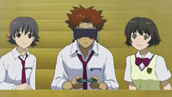 While leaving home, Kyo notices an envelope from Celebrum with a game stick inside for a “Pain of Zega” game. Today is the big day when Kyo gets to show off the promotional video for the swim club that he and Ryoko made. Everyone is excited about seeing Shizuno and about the video itself, but no one joins the team. Seeing Shima there, Kyo uses the chance to ask him about telling everyone about the “Pain of Zega” thing he got, but Shima doesn’t care as long as Kyo protects his promise to Shizuno. Ryoko and Tomigai already seem to know about it, and hook it up so that Kyo can play. The introduction of the game says that in 40 years, the planet will be transformed by an environmental modification experiment and that the Celebrum is the resistance organization against the Gards-orm. The game itself is like a simulation of the battles that he fights in the Zegapain Altair. He fights to a Deutera Area, which, as Ryoko’s little brother explains, is an environmental experiment area that will cause mankind to lose the fight if it is allowed to cover the entire world. Kyo starts to wonder about why he’s fighting in the other world. During this time, Ryoko runs into Shizuno on the street. Her friend Mizuki asks Shizuno about the alleged kiss between her and Kyo, and Ryoko is surprised that Shizuno replies that it felt good. Shizuno continues on about Ryoko’s video making skills and the conversation switches to dreams and the future since Ryoko wants to be a director.
