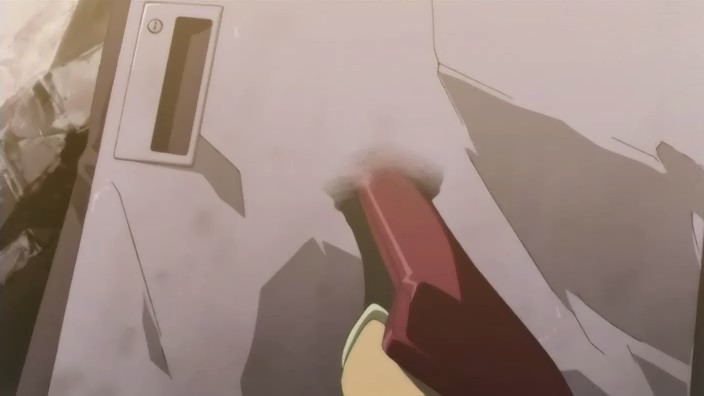 Back at Ryoko’s apartment, Kyo is led to a locker after beating a certain level of the game. When he opens it, he sees a message telling him to be careful about being involved with Misaki Shizuno. He then gets a mail from Shizuno asking to meet him, and so he goes. The two enter the Zegapain world and are sent to a Deutera Area, just like in the game. Kyo notices that his body seems to remember this place and the movements he’s making, but not because he played it in the game. Along with the Garuda pilots, Kyo and Shizuno are successful at destroying the enemy core structure. When the fight is over, Kyo gets off the Altair and remembers the locker he saw in the game. He notices that same locker nearby, but gets interrupted when parts of the building start to crumble. Words appear behind the Altair warning him not to believe the world he sees. Even though Shizuno tries to stop him, Kyo still tries to open the locker. However, his hand disappears in the area right around it. Kyo can’t believe what he’s seeing and asks Shizuno about it.