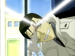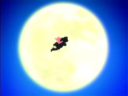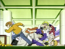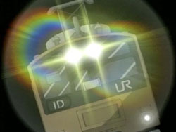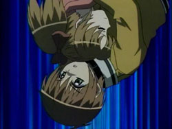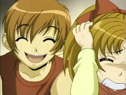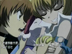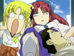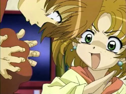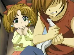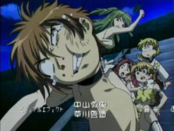 Afterwards, Keita, Tomohane, and Karina track the badger down to a supermarket. Their efforts to catch it are initially interrupted by Tayune, who’s out shopping with Sendan and Furano. The three Inukami help surround the badger, but everyone except for Tomohane ends up stuck together as a result of the badger’s powers. Tomohane continues the chase by herself, but has no luck catching it. It’s dark outside by the time she follows the badger onto an overhead beam above some train tracks. Tomohane becomes afraid of falling down and starts to cry. In tears, she watches as the badger slips and falls between the two trains that are passing by in both directions. Tomohane jumps after the badger and flies it to safety. But doing so drains her of her powers, and so she goes tumbling towards the river below. Keita, who has been freed from the others, makes a diving catch and protects her from the impact of the water. On the riverbank afterwards, Tomohane apologizes to Keita, but he says that she should be apologizing to Sendan and the others and especially to Youko. He doesn’t care about their fights, but says that he hates it when they try to surprise attack each other. Karina then decides to let Tomohane take care of the badger. Keita finally emerges from the porta-potty and starts groping Tayune and Sendan. But before Tayune can punch him, Youko arrives back early and starts beating him with a frying pan.