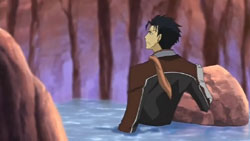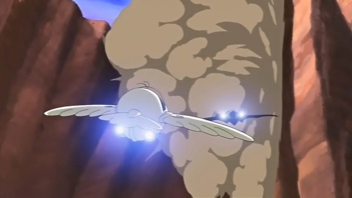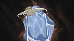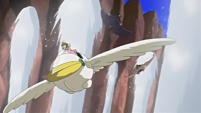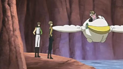 Sakura is concerned about Syaoran, but she continues the race at his urging. The next obstacle in the race consists of various geysers shooting up while the racers navigate a canyon. Using her intuition, Sakura is able to avoid all of them. She pulls up to Kurogane, but another explosion occurs above them. Kurogane uses his ship to knock Sakura out of the way, but the blast crashes him into the water. Kurogane also wants Sakura to keep going, so she does. Meanwhile, Syaoran and Ryuuoh, using the sensor, figure out where the interference is coming from. At the race headquarters, Kurogane presses Tomoyo for the truth until she admits that she was the one who was responsible for the interference during the qualifying race. The purpose of all this was to return the feather to Sakura. Tomoyo explains that the feather, which was considered a mysterious energy source, was found one year ago. A little while later, Tomoyo heard from someone that this feather belongs to Sakura, but this occurred after an official announcement had already been made about it. Since everyone was now interested in the feather, the company couldn’t just hand it over to Sakura anymore, so they made it the race’s prize. Tomoyo hadn’t been worried that Syaoran and company would lose because that person had said to believe that in their group’s strength.