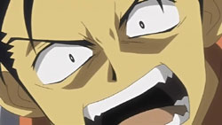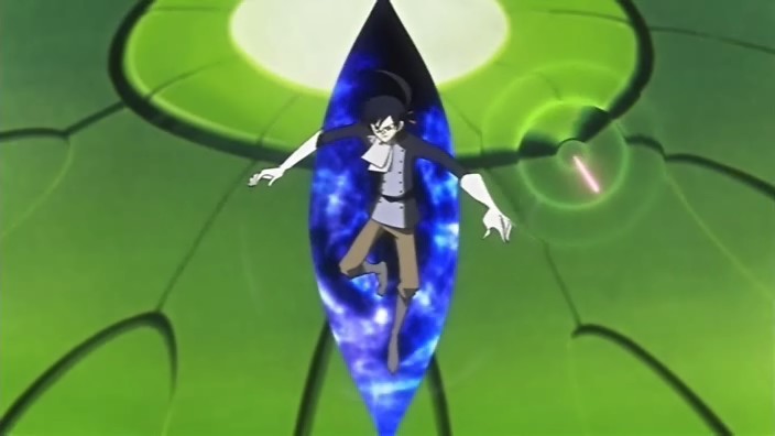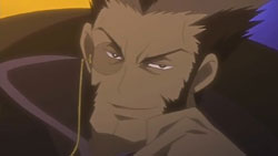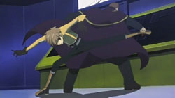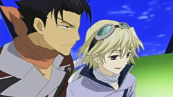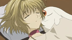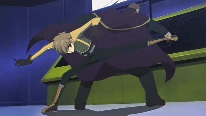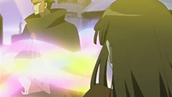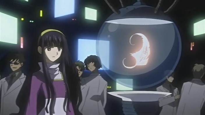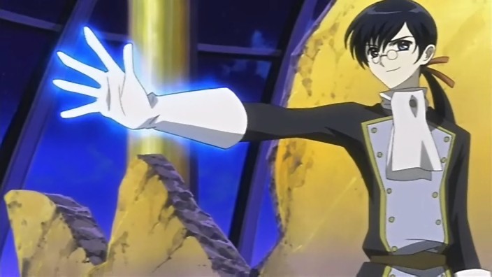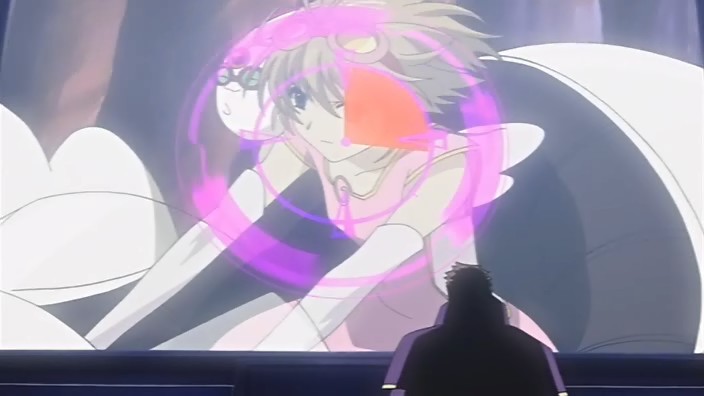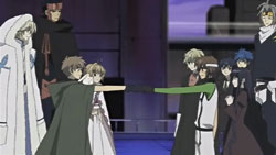 At the victory ceremony, Tomoyo hands the feather over to Sakura. However, before Sakura can absorb it into her body, an explosion behind her throws her down. In the smoke, a figure appears and disables Tomoyo’s guards – it’s Dr. Kyle. He uses his powers to pull the feather towards him, but fortunately one of Mokona’s 108 Secret Techniques – the super-sucking power – gets it back. Syaoran quickly returns Sakura’s feather back to her. Kyle says that this is just like what happened in Jade Country with the unusual living thing (Mokona), a statement that causes Fye, Syaoran, and Kurogane to realize that this must be the same Kyle from back then. Kyle says that in each world, they can find the same faces but different people, but he warns that there’s no way for them to ascertain if it’s really a different person. With that, Kyle leaps up and disappears into a void.