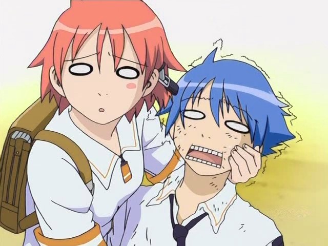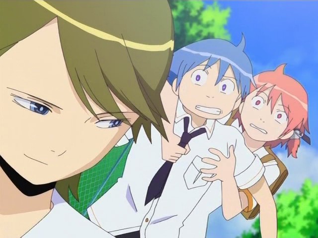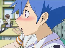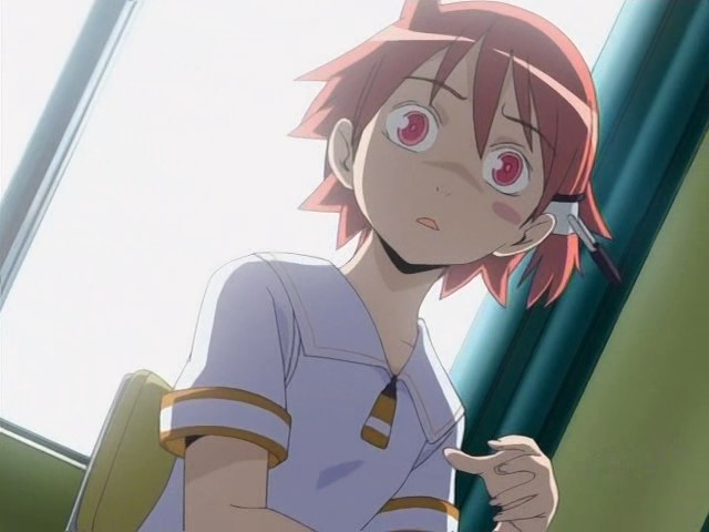 The next day, the two go to school together. An energetic Tenko accidentally falls down some bars that she’s trying to walk on, but Samatarou catches her. In class, his friend tells him that there’s going to be a female exchange student coming today. Tenko thinks to herself that since he’s surrounded by goddesses, Samatarou wouldn’t have any interest in normal girls. But as it turns out, Samatarou can’t keep his eyes off of the new girl, Komori Kumiko. Tenko can’t believe that Samatarou declares (twice) that this girl is beautiful.