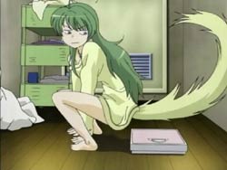 Youko is weighing herself and isn’t happy with what she sees. For whatever reason, she starts to suspect her tail, so she starts a workout and diet for it. At school the next day, Youko pays a visit to Keita to show off that her tail lost four grams. One of Keita’s schoolmates, a guy named Kawarazaki Naoki, then comes onto the roof with a request for Keita to find a person. Actually, Keita doesn’t have to do anything because the person Kawarazaki is searching for is none other than Youko, who he had seen on the street one day. Kawarazaki wants Youko as the model for his heroine for his comic. Youko initially is thrilled, but that turns to anger when he compares her tail to a raccoon’s.