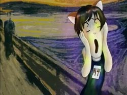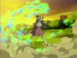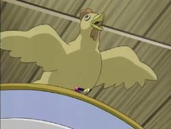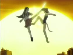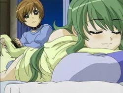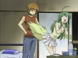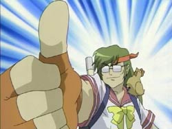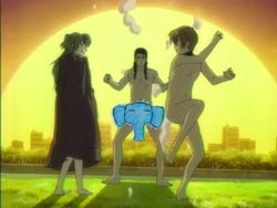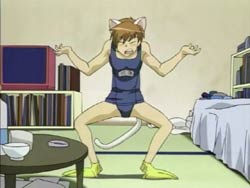 When Kawarazaki comes to their apartment, the chicken reacts to him and takes a spot on his shoulder. It seems to read his mind, transforming Youko into a magical cat girl and Keita into a cat boy in a girl’s school swimsuit. Kawarazaki runs around town with his newfound powers transforming everyone in sight. Keita knows that the cosplay wears off after two hours, which will leave everyone naked. He finally confronts Kawarazaki by the water during the sunset and the two proceed to have a fight. It ends in a draw, and Kawarazaki escapes via the river. The special investigator Karina arrives and takes the chicken, which is now smoking because its used up its powers. He explains that the chicken read people’s minds and changed appearances. Back at home, Keita is combing Youko’s tail and comments that it’s thinner now. Youko blows him up because she thinks he’s being sarcastic since her tail has actually gotten fatter.