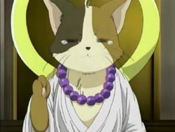 At home, Keita tries to speak up for Kawarazaki. Youko suspects something is up and she’s right: Keita promised a date between her and Kawarazaki in exchange for one week’s worth of lunch bread. Just as Youko is about to kill Keita again, the cat from the hot springs shows up, dressed in a Buddhist costume. Soon after, a black shadow comes into their apartment and puts Keita and Youko into costumes too. The black shadow is actually a wooden chicken, the one Karina had told Keita about on the previous night over the phone. This chicken has special cosplay powers (ones that prevent the victims from taking off the clothes) and followed the cat here.