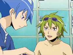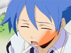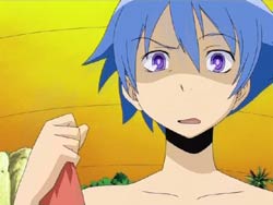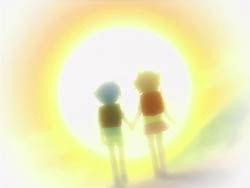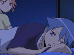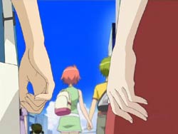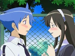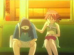 At Tenko’s suggestion, they go on a waterslide. Kumiko and Kumiko go down together, but the tube seems to go on forever. That’s because Samatarou’s sisters are once again interfering. When the two finally do emerge and fall into the pool below, Kumiko is missing her top. Samatarou happens to be holding it, which earns him another slap for being a pervert. The trip home on the train has Kumiko trying not to make eye contact with Samatarou and talking with Shinichi instead. Tenko tries to comfort by Samatarou by holding his hand in Kumiko’s place, but he refuses it. The train passes onto a bridge and the two are able to see the sunset. It reminds Samatarou of his childhood with Tenko, walking together hand-in-hand towards the setting sun. He then takes Tenko’s hand and smiles at her, and action that Kumiko notices.
