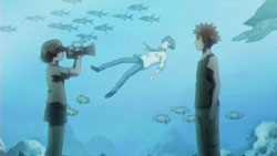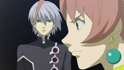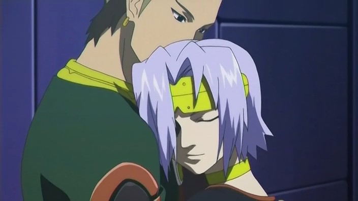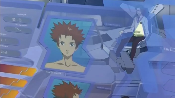 Kyo finds himself in the aquarium tank, watching as the earlier scene between him and Ryoko unfolds on the other side of the glass. He experiences a flashback of the self-destruction on the lunar surface, and then swims towards the surface of the water. He gets teleported to the Zegapain hanger where he has a brief run-in with Lu Sheng. On the bridge of the Oceanus, Shima is talking to Shizuno about how Kyo is on the verge of self-destruction. Lu Sheng joins their conversation and suggests that a hammer can fix a curved nail – they’re at the point where drastic measures are needed. Back in the hanger, Kyo interrupts a moment between Chris and Arque with more talk about being alive. After seeing the two in each other’s arms, Kyo wonders if perhaps he’s feeling lonely.