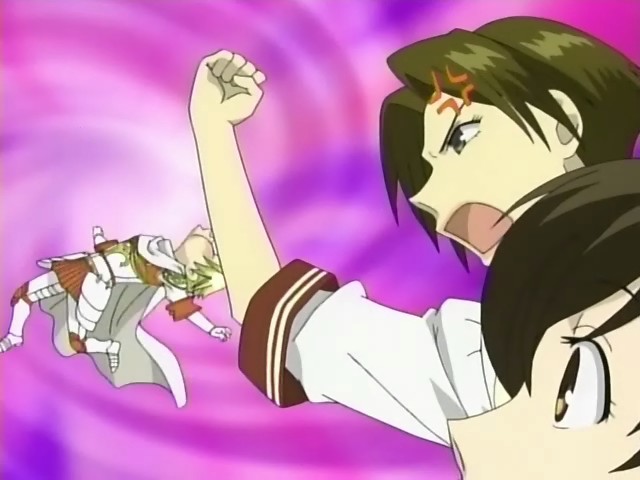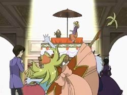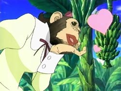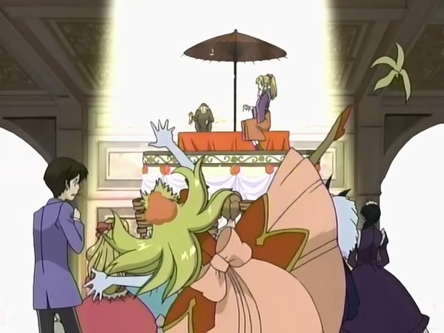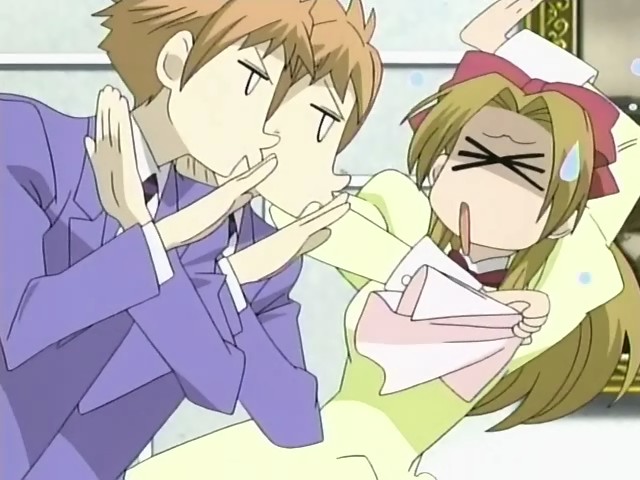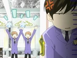 The ridiculousness of the situation causes Haruhi to start laughing uncontrollably. She asks why they’re doing this and Hikaru responds that it’s because they want to stay in the club together with her. Haruhi apologizes to Benio and says that she’s got her own future goals, which is why is studying here. She also confesses that she never had any intention of leaving Ouran. The guys are very happy that she feels this way, but Tamaki asks her why she got so angry yesterday. Haruhi says that naturally she got mad because they took her things and sold them. Before the Zuka girls leave, Benio declares that they haven’t given up and swears to smash the Host Club. The girls dance away, but the monkey throws more banana peels and they all slip. Renge rises up one more time and dramatizes the situation. When Tamaki protests her coming up whenever she wants, the monkey beside her throws a banana peel and makes her slip.