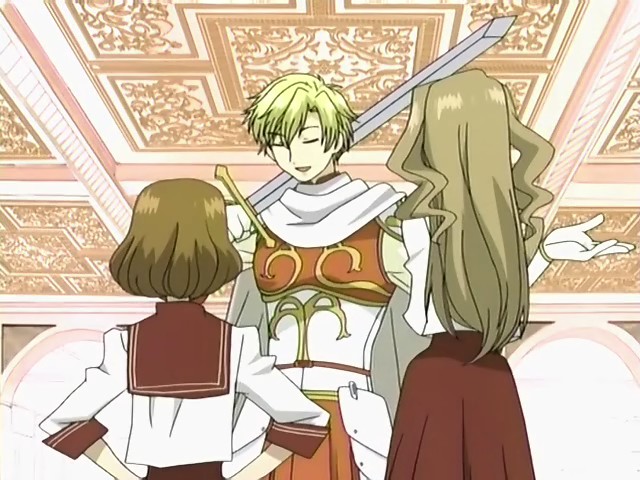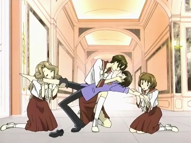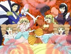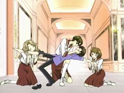 Today starts a special event where students from other schools are coming to Ouran High to see the culture clubs. The twins decide to send Haruhi out to buy some instant coffee. She’s not too happy to have to do it, but the other girls tell her that it’s thanks to her that Kaoru and Hikaru are having so much fun. They used to keep to themselves, but they’ve been much more social since Haruhi came. On the way back from the store, Haruhi slips on a banana peel (thanks to a random monkey) and falls right into the arms of a girl in a different uniform. This person, who immediately recognizes that Haruhi is a girl, brings her back to the Host Club. Her two friends are already there, having met the club members who are dressed up as knights today. Tamaki had tried to woo them by saying that he’d protect them even at the cost of his own life, but the girls just shot back by claiming that his statement was arrogant and that men are lower life forms who consider their own honor to be most important. The third girl, the one who caught Haruhi, then makes her entrance by saying that if she were the lover, the girl would never be left alone. This tall, short haired girl then swears to Haruhi that she’ll never leave her side.