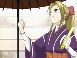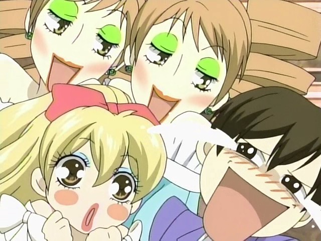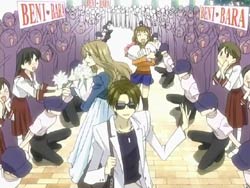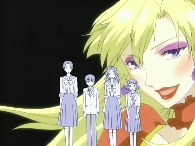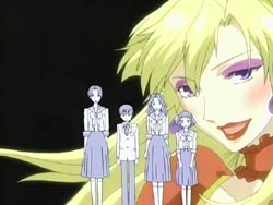 When the three girls start admiring Haruhi as a girl, Tamaki tries to stop them, but he gets punched by the tall one. She says that Tamaki is even more of an imbecile than the rumors suggest. She also calls the club’s history short and the group frivolous. Kyoya recognizes that the uniforms of these girls belong to Lobelia Girl’s Academy. Actually, that would be St. Lobelia Girls School’s High School Division. The three girls introduce themselves as Amakusa Benio (the tall one), Maihara Chizuru (the long haired one), and Tsuwabuki Hinako (the youngest one). They are part of Lobelia’s White Lily Group, otherwise known as the Zuka Club. Tamaki is in shock at the sight of them whereas Hikaru and Kaoru can’t stop laughing. Renge then comes in through the floor to explain that Lobelia’s Zuka Club considers women to be supreme over everything else and hold such activities as tea parties to discuss what it means to be a girl. The top members can even perform songs and dances. Those top members would be none other than the three girls standing in front of them now.