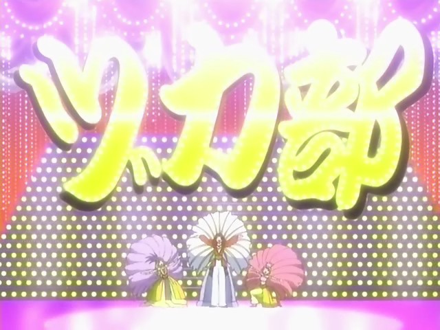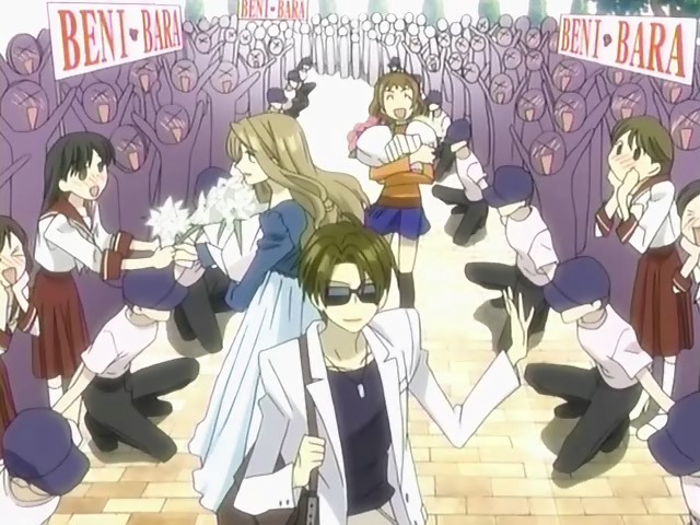 After thinking about the situation, Tamaki suggests that maybe it’s better for Haruhi to go to the Zuka Club. The other guys realize that everything would work out for Haruhi if she went to Lobelia, but Tamaki still has a secret plan. The next day, after a Zuka Club performance, the three girls return to the Host Club room with Haruhi. Inside, they find the Host Club all (except for Mori) dressed up as girls and singing the club name. Benio accuses Tamaki of mocking the girl’s culture, but Tamaki’s plan revolves around the “omake” (extra) concept. By choosing the Host Club, Haruhi would be able to have both males and females – basically she can experience both the Zuka Club and the Host Club by staying with them.