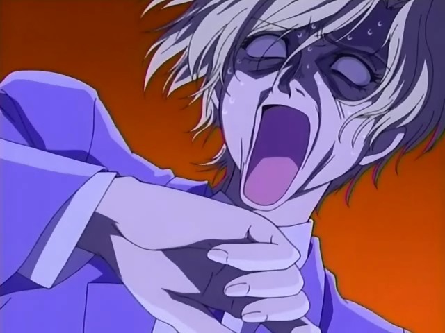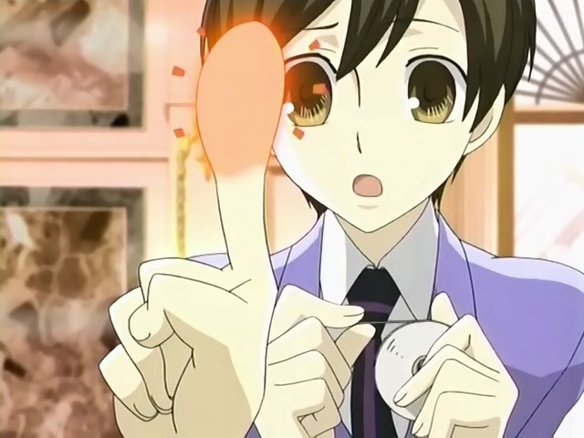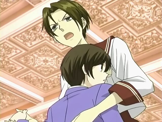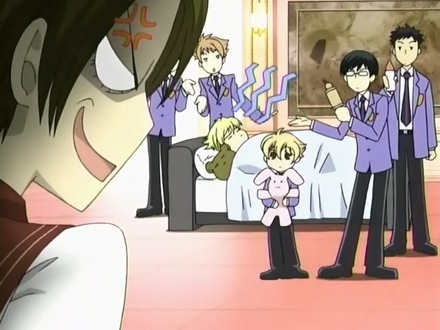 The guys of the Host Club couldn’t be less interested though, and it prompts Benio to lament at how they involved an innocent school girl (Haruhi) into the club. She opposes the Host Club because they trifle with pure girl’s hearts using false love. She attributes it to Tamaki being a half-blood and says that the club is using its activities for personal profit. She and the other two then vow to abolish the Host Club. Kyoya asks her to put that on hold because Tamaki is sleeping from culture shock. Haruhi brings the girls some coffee, but then Tamaki wakes up and starts protesting about the girl on girl love relationships that the Zuka Club promotes. However, he slips on another banana peel (again the monkey) and dips his finger into the hot coffee. Haruhi helps bandage it up for him and reveals that she got the bandages as a gift from the store where she bought the instant coffee. It’s a store that always has bonuses like that. Anyway, Benio grabs Haruhi and says that they should start transfer procedures for Haruhi to enter Lobelia and be taken in by the Zuka Club.