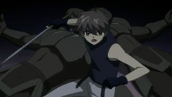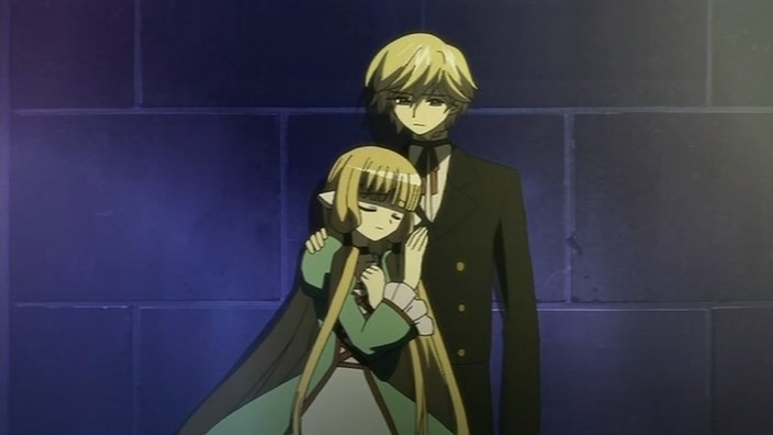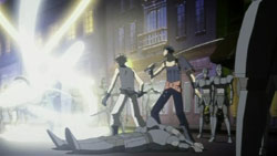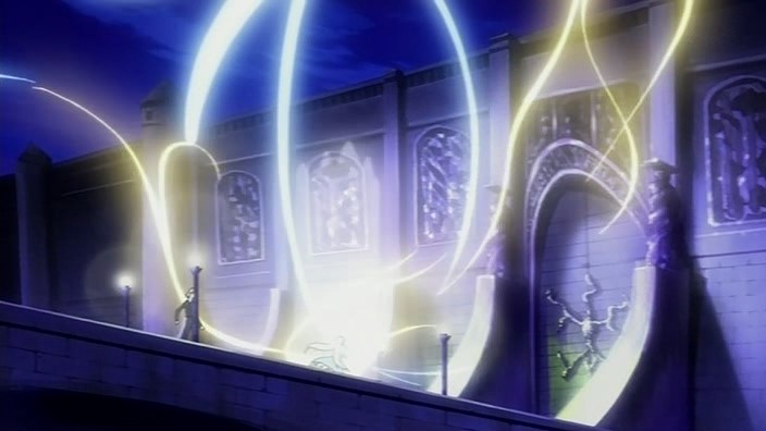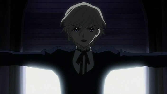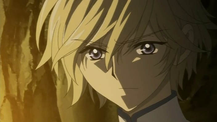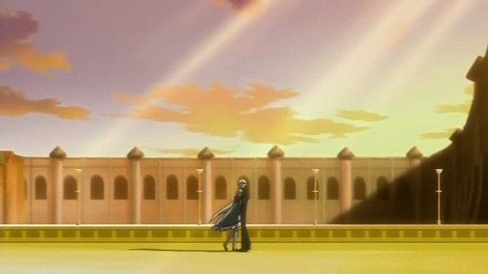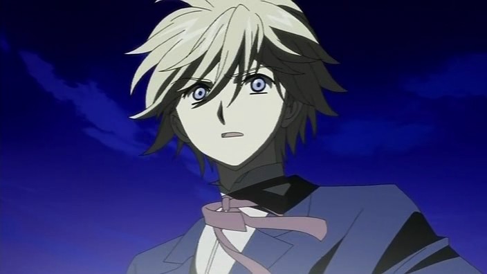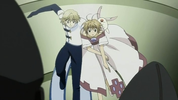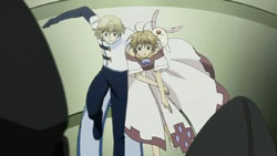Back at the store, Touya and Yukito are explaining to Syaoran and the others that Chi was created by a powerful magician. Her type can use magic and look just like humans, however they cannot set foot outside of this country because the magic that created them is only effective here. If she does leave, her body will disappear. Touya and Yukito had already informed Fye earlier. Yukito adds that if something happens to Chi, it’ll stay night in their world forever. Speaking of which, Fye and Chi happen to run by outside because they’re now being chased by the stone guards. Kurogane and Syaoran help them out by defeating some guards, but it’s Chi who teleports herself and Fye away. She brings them to the gate leading out of the city and opens it. Knowing what will happen if she leaves, Fye stands between Chi and the gate.