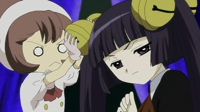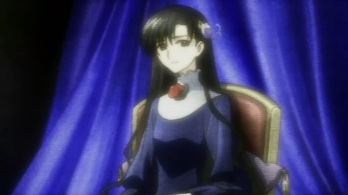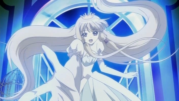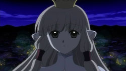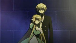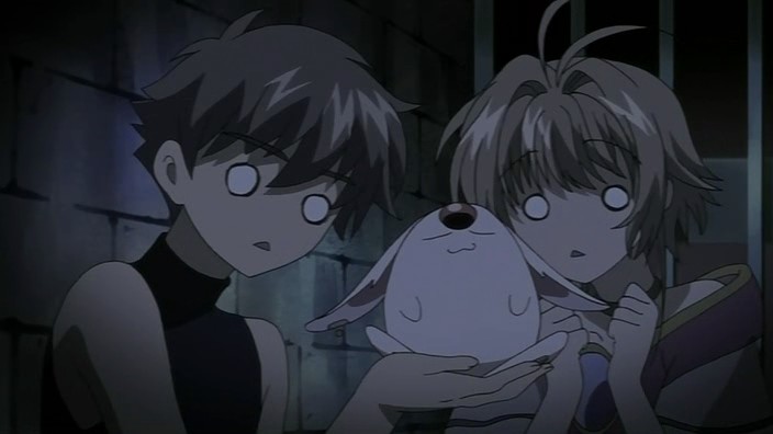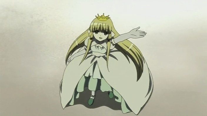 Sumomo and Kotoko then appear and transport the entire group to the castle. Kotoko describes herself and Sumomo as magical ghosts who serve the king. They want Fye to use his magic and convince the king to be the king. However, since Fye doesn’t use magic anymore, Sumomo and Kotoko teleport them to a special room: a jail cell. Mokona can’t detect any of Sakura’s feathers in this world, and Kurogane decides to break them out. Syaoran and Kurogane fight the stone guards and tell Fye and Sakura to run away. The two escape to the top of the castle and enter a room there. Inside is the girl king – someone that Fye instantly recognizes – Chi.