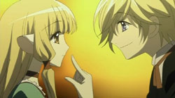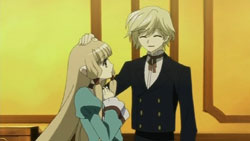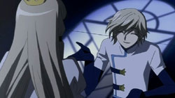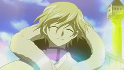 Sakura returns to Syaoran and Kurogane, who aren’t fighting anymore because the stone guards around them disappeared. Syaoran thinks that Fye might have taken Chi to the Touya’s store. Indeed, the two are there and now have new outfits. Fye first takes Chi out to a cafe and the pair enjoy drinks together. Fye starts to teach her some words as they take in the carnival atmosphere around them. Eventually Chi can say enough to ask him where he came from and where he’s going. The answer to the first question is a far away place and the answer to the second question is that he doesn’t know – but he can’t go back to the world he came from. Fye explains that he’s running away so that he doesn’t have to meet that person again. Chi notices that Fye looks lonely, but Fye denies it and smiles. She gets a little closer to him and says that she wants to remain together with him for a long time. Fye is a little surprised to hear her say this. Chi then thanks Fye for today. He puts his arm around her shoulder and says that he should be the one thanking her – it’s been a long time since he had this feeling.