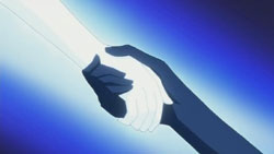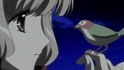 Chi wants to go with Fye; she wants to run away with Fye. These words have a profound effect on Fye, and he almost wraps his arms around her, but settles for placing his hands on her shoulders. He won’t let her do it because running away is a very painful thing. Chi thinks that if they do it together, the pain will be cut in half, but Fye thinks that it’ll probably double. Chi starts crying because she doesn’t understand. The pair of birds that she set free earlier fly by and one lands on her hand. Fye suggests that they go back because everyone is waiting. With tears in her eyes, Chi hugs Fye and the sun starts rising. Sometime later, as Syaoran and company prepare to leave, Sumomo and Kotoko thank Fye for Chi’s safe return. Fye attributes it to Chi’s own decision. As the rainbow colored swirls surround Fye, he says goodbye and thank you to Chi. When she doesn’t understand what 「さよなら」 (sayonara – goodbye) means, Fye explains that it’s something you say when you’re parting ways; it means let’s meet again. Chi uses this new word and bids Fye farewell. After he’s gone Chi once again echoes “goodbye.”