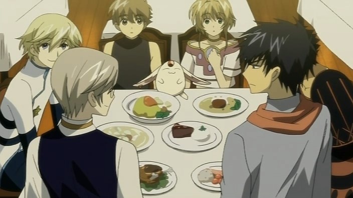 Fye is having a dream where he is running from Ashura-ou. Right as Ashura-ou opens his eyes in the dream, Fye wakes up. The group enters a new city in this new world, and is greeted by Touya and Yukito. These are of course not the same two from Clow Country. It seems that everyone who lives in this world can use magic, as Touya shows by created a meal for Syaoran and company. His specialty is food whereas Yukito is a tailor. Yukito goes on to say that this country chooses a king from its people, and that Touya used to be the king. Touya explains that every year everyone has a dream and the person in that dream becomes the next king. However, the current king isn’t fulfilling the responsibilities and as a result, morning won’t come for this country. In fact, it’s been months since they’ve seen daylight. Without it, they’re beginning to lose their magical powers.