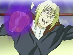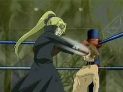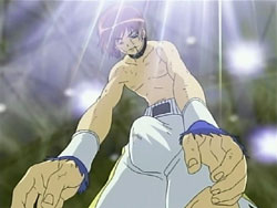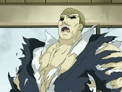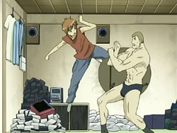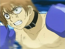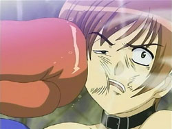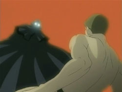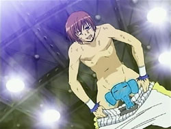 When the Sea of Violence arrives, Kei refuses to run away as Keita fights. To Youko’s surprise, Keita taps her out of the ring and erects a forcefield around it. He starts boxing with the Shinigami, but he’s unable to land a hit. The Sea of Violence counters with some nasty punches that send Keita flying across the ring. The fight continues like this until the Sea of Violence delivers what’s supposed to be a killing blow; it knocks Keita’s mouthpiece out of his mouth. However, Keita had branded that mouthpiece with one of his signature frogs, so it rises up and explodes in the Shinigami’s face. Keita then lands a special punch in the Shinigami’s gut – special because his glove is filled with the frogs, all of which explode on the hit. Keita does the same with the other glove, landing the exploding punch on the Sea of Violence’s face. And that’s not all; Keita still has what he refers to as his proud son: his bulging crotch. He pulls down his pants, revealing Mr. Elephant, and shoots a barrage of frogs. Still standing after the dust clears, the Sea of Violence tries to unleash an attack on Keita, but it just bounces off the forcefield and back at him.