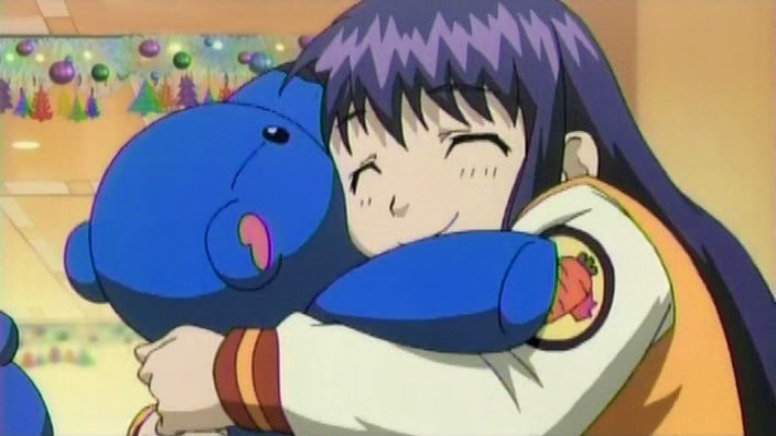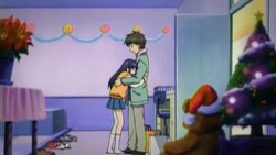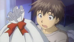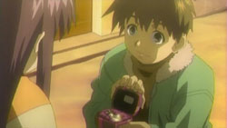 Back in the present, Choko finishes her lunch and the two siblings continue through the store. Haruma’s attention falls on a Santa Claus piece of jewelry, and he fantasizes about giving it to Ayano as a Christmas present. While he’s looking at it, Choko gets bored and sees a boy carrying a balloon. She follows him up an escalator, and then spots a bin of blue teddy bears. Haruma finally notices that she’s gone as he’s making his purchase. He goes up the escalators looking for her, but she happens to be coming down the other side and the two miss each other. Haruma finds her only after he gets alerted by store’s intercom system. Choko can’t stop crying when she finally gets to see him again. Realizing how worried Choko had been, Haruma decides to give her the Santa Claus piece he bought earlier. In return, Choko gives him a kiss on the cheek. Like it’s written in her notebook, Choko explains that the kiss was a thank you for the present from her brother.