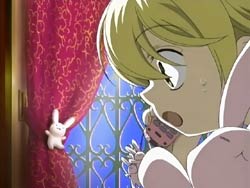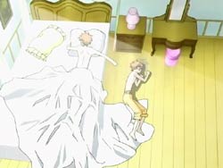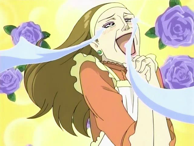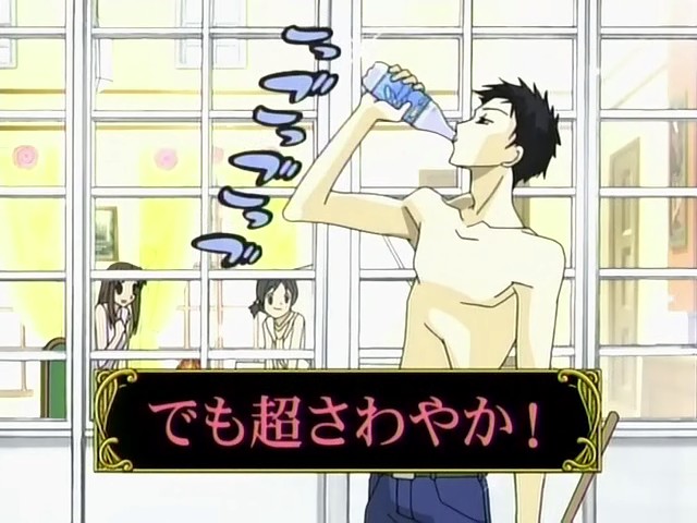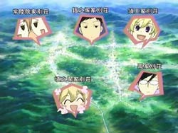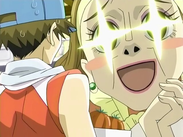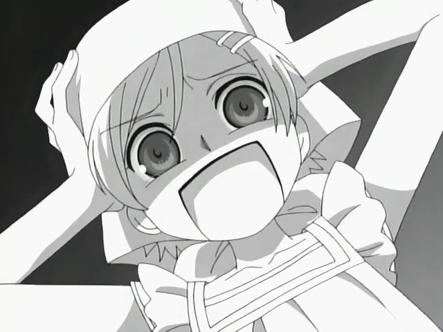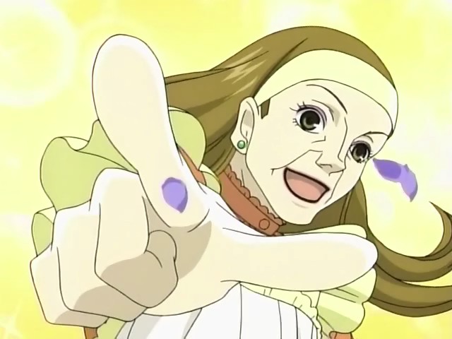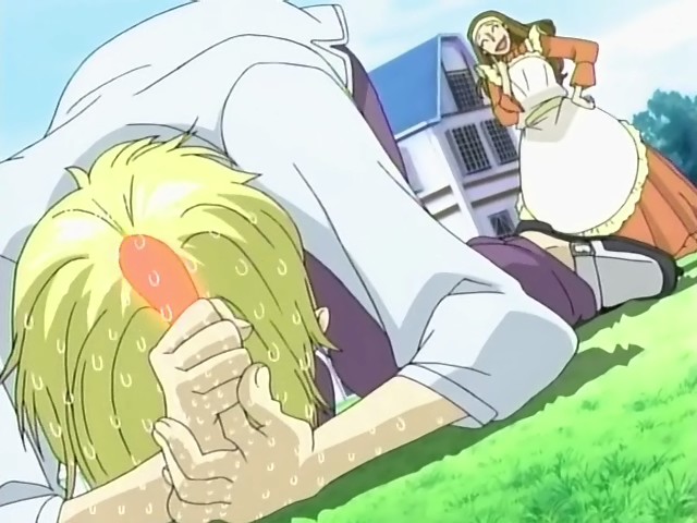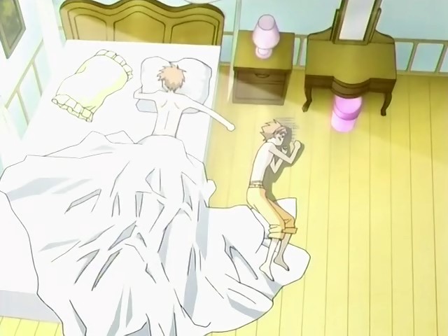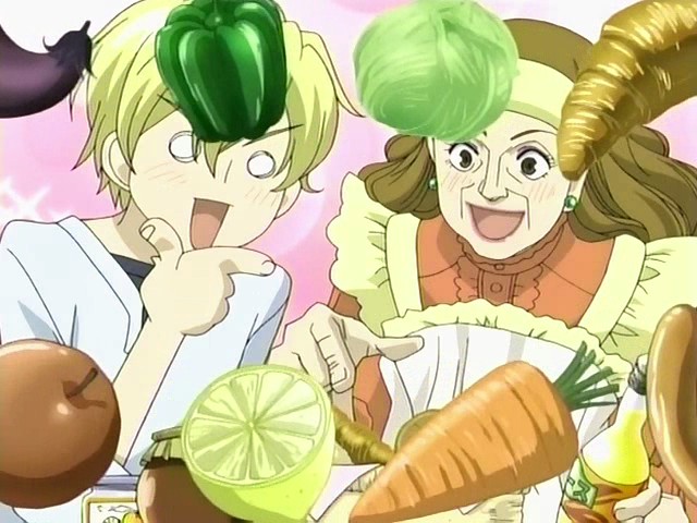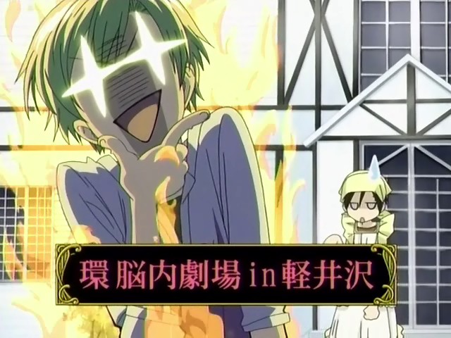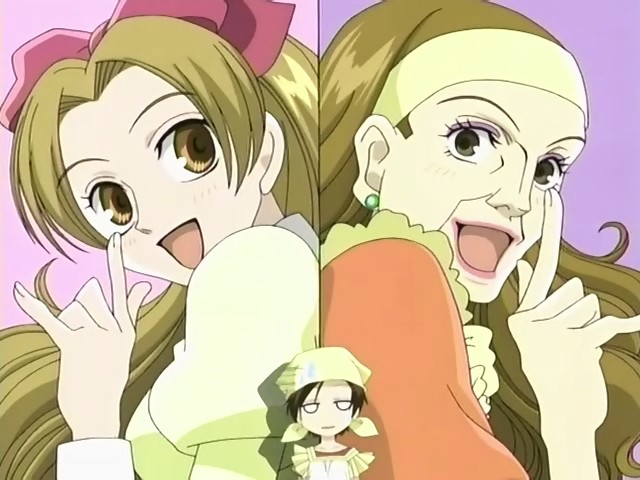 Haruhi gets frustrated with everyone here and wants them all to go home, so Kyoya pulls out the school regulations and reads Number 19: part-time jobs are forbidden. With this being held over her head, Haruhi has no choice but to let them stay. Tamaki thinks that they’ll be staying at the pensione as VIPs, and has a fantasy of seducing Haruhi when she brings him breakfast. Unfortunately for them, Misuzu only has one free room. As leader, Tamaki thinks that he should get it, but the twins suggest instead that they play a game to decide who gets to stay, a Refreshing Work for the Guest Room Competition with Misuzu as the judge. Misuzu is of course more than happy with this arrangement.