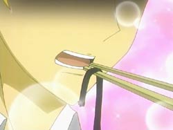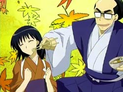 -Hanai tries to feed Yakumo his nabe. But he keeps breathing on in an attempt to cool it down, so she keeps resisting him.