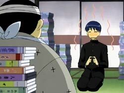 -Nishimoto suffers injuries when he tries to protect his “reference books” during an earthquake. Those references books are actually all of his dirty videos. Nishimoto takes Mai’s advice to put the stuff in boxes, but he’s got so many DVDs that the stacks reach the ceilings.
