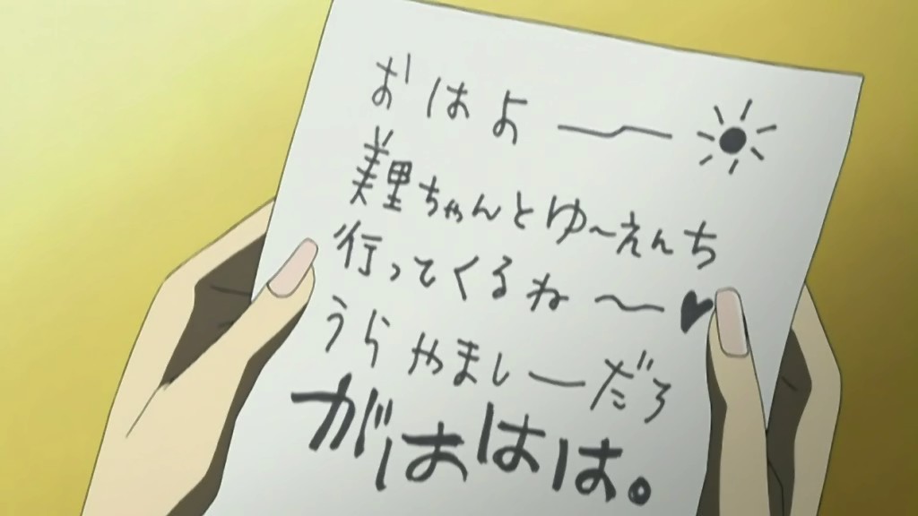 Awww, no Minnie Mouse ears. It’s a shame they probably didn’t have the rights to show those ears because they would have matched Misato’s dress too. They didn’t go to Disneyland either, just a generic amusement park. This isn’t really a complaint though, just wishful thinking. The animation quality for this episode was a little lacking during the end, though I loved how they synced the song with the actions of everyone on screen during the concert scene.