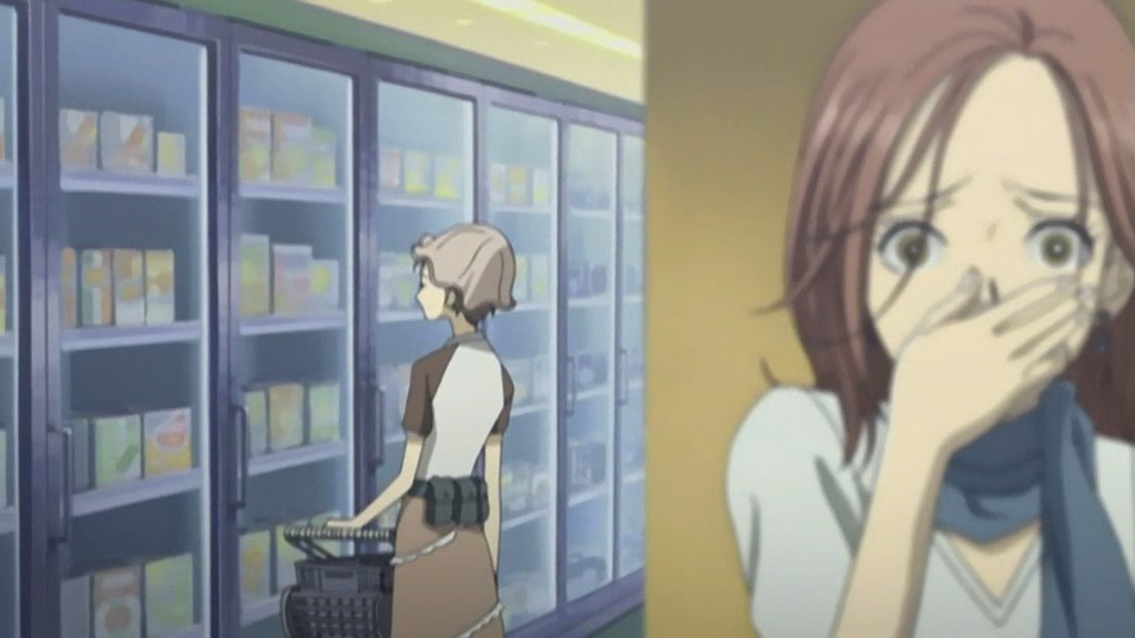 The next morning, Hachi discovers a note from Nana saying that she went with Misato to an amusement park. An angry Hachi goes out shopping, but can’t buy anything because she doesn’t have any money. By evening, she’s thinking of going to the Jackson Hole, but she’s also worried about seeing Shouji there. She decides instead to go to the supermarket to buy food to cook. But when she gets there, she spots Sachiko also buying groceries. Thinking about Sachiko going to Shouji’s place and cooking for him in that kitchen, Hachi starts crying and runs home. Misato and Nana are already back, having happily returned from the amusement park. Remembering how Sachiko took Shouji away from her, Hachi doesn’t want anyone to take away her things anymore. She snaps out, asking if Misato is going to be living her. Hachi then declares that this is her home too and that Nana shouldn’t do whatever she wants.