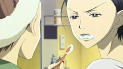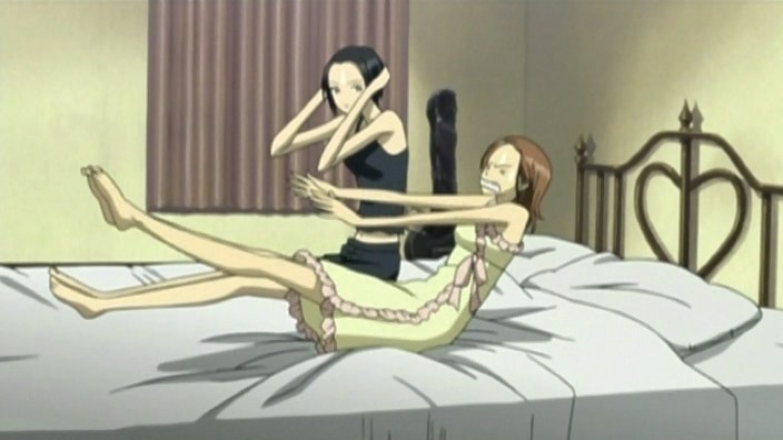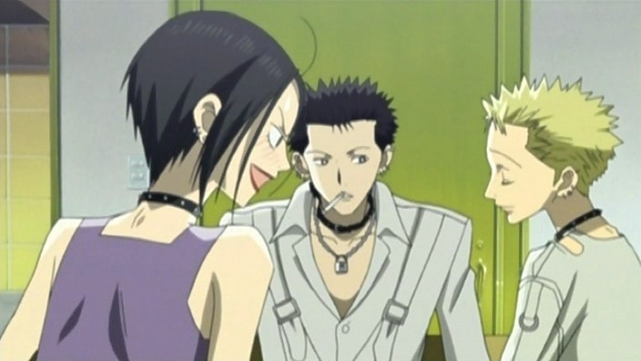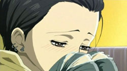 After a bit of thought about falling in love with Yasu, Hachi asks him if he has a girlfriend. Yasu tells her that, unfortunately, he hasn’t done very well with women. It’s at this point that Nobu and Shin arrive and tell Yasu that the mahjong tournament with Ren is going to happen. As the guys start looking at the Trapnest pamphlet that Hachi got at the concert, Hachi realizes that even Shin and Yasu are calling her “Hachi” now. Nana eventually comes in and immediately takes the cigarette out of Shin’s mouth. It seems that she’s decided there will be no smoking by anyone so that she can improve her breathing capacity and be a better singer. Nana even starts to exercise through sit-ups at night before bed.