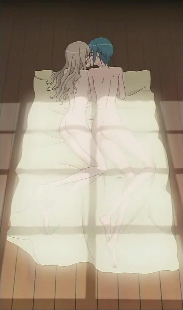 So Hikari brings back Amane’s memory with a song. It’s fitting given how much they’ve made that song all-important, but that doesn’t make it feel any less cheesy. I certainly laughed out loud when I realized what they were doing. And then the two girls decide to consummate their newly renewed love, so they had a fun little romp together (extra-large image courtesy of someone on 2chan). If nothing else, I’ll give this show a lot of credit for pushing the limit a lot without going R-15.