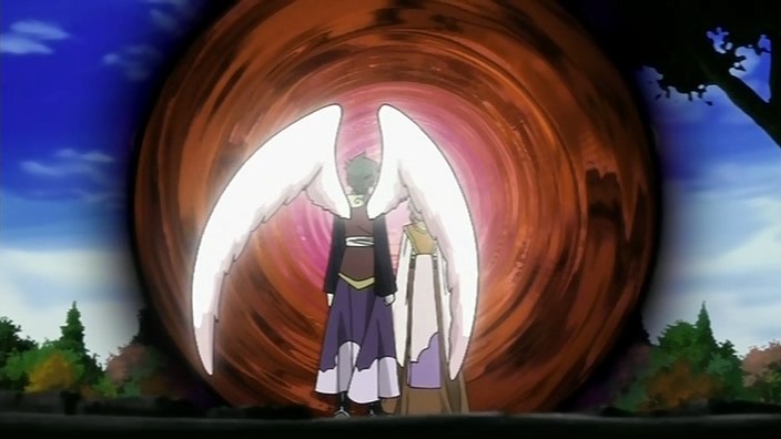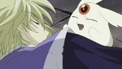 -Chaos releases Sakura, but she refuses to go with him. He reaches his hand out to hers and triggers something that causes Sakura’s eyes to go dead. Mokona tries to warn Sakura, but Chaos throws Mokona off. He spreads his wings, which are made of numerous real feathers, and opens a portal so that he and Sakura can travel through the dimensions. However, seeing that Sakura is crying with her lifeless eyes, Chaos decides not to enter the portal with her and instead flies her back to his castle. He knows that if her heart hasn’t changed, then there’s no meaning to traveling together.
