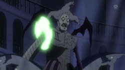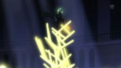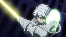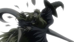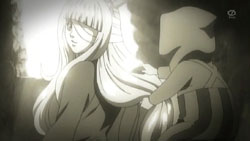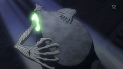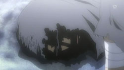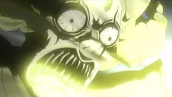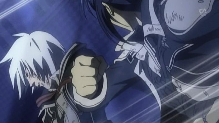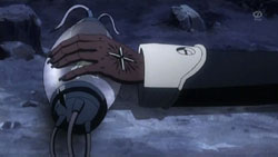 Kanda draws his sword against Lala, but Allen steps in to declare that he will be the sacrifice by destroying the Akuma. Kanda punches Allen for that, calling him naive, and questioning if there’s anything important to him. Indeed there is something important to Allen, but he confesses to have lost it a long time ago. He feels that he can’t throw away what’s in front of him, so he wants to protect what he can. However, this conversation is interrupted when Lala and Guzol suddenly get impaled and pulled away. The Akuma is back and now it has extracted the Innocence from Lala. Seeing the bodies in front of him, Allen becomes surrounded by a purple mist and his arm starts changing into a gun. Allen proceeds to fire rapidly on the Akuma, but it appears to have disappeared. Actually, it has taken on a sand form and manages to swallow Allen up. Allen soon frees himself and brings out a blade from his gun which he uses to cut the Akuma’s sand outfit in half, exposing the monster inside. It attempts to defend itself against Allen’s gunfire by using the copy of Allen’s arm, but that is not powerful enough. Unfortunately for Allen, he suddenly coughs up blood and his new gun arm reverts back to its normal form. Seeing an opportunity, the Akuma lunges for Allen, but Kanda is there to defend him.