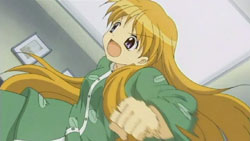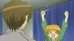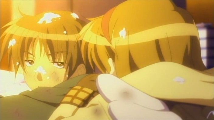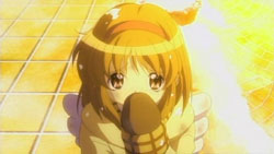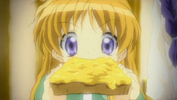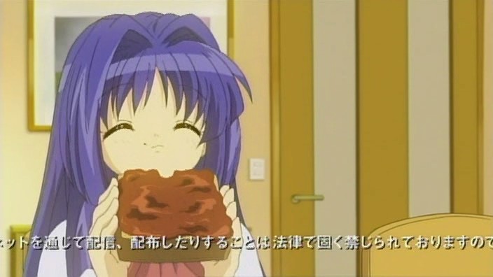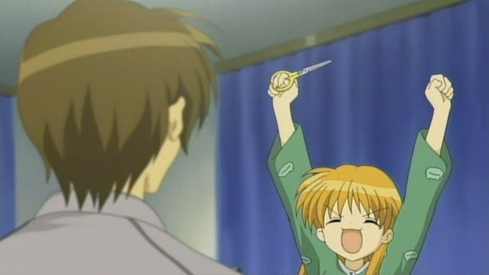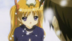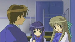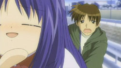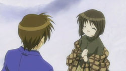 Makoto is sneaking into Yuuichi’s room again, but he’s waiting for her. He notices that she’s got a pair of scissors, but Makoto insists that they are for making paper airplanes with him. She grabs the nearest notebook she sees and cuts out some pages to make airplanes out of, but Yuuichi freaks out when he realizes that the pages are actually part of his homework due tomorrow. The next morning, Makoto has to get up early because of her new job at the nursery. Unfortunately for her, Akiko decides that they should celebrate her job with some special jam. A curious Makoto eats some and immediately starts to feel the effects. On the way to school, Nayuki notices a stray cat and starts to approach it, but Yuuichi stops her and reminds her that she has an allergy to cats. Despite the warning, Nayuki frees herself from his grasp and tries to get the cat that she finds so cute. She feels those allergy effects later during school, but by that time, Yuuichi is off having a brief chat Shiori outside again who reminds him of their promise to make a large snowman. When lunchtime comes around, Yuuichi heads upstairs and eats with Sayuri and Mai. He once again has a hard time getting Mai to talk, so he ends up chatting with Sayuri while Mai eats.