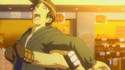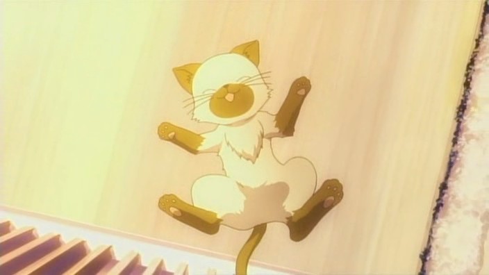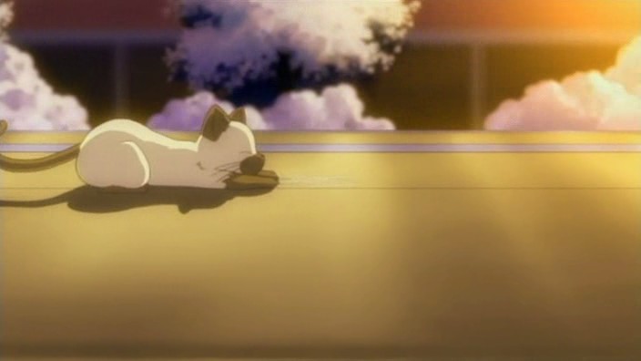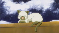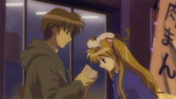 Right as Yuuichi is raising the topic of Makoto saying Auu whenever she’s troubled, the cat from that morning shows up at her feet. He notices that it has taken a liking to her, but she only takes it into her arms after he promises to buy her meat buns. The cat takes it’s place on Makoto’s head, though it later leaps down and takes the first meat bun that Makoto picks out. Afterwards, while standing on a pedestrian bridge, Yuuichi is wondering what they’re going to do with a cat since they can’t take it home because Nayuki is allergic. Makoto feels that it’s ok not to think about it and notes that if an animal is not needed, then it gets thrown away. She also says that they should return it to the fields before it can understand what peace is. As Yuuichi is trying to understand that last statement, Makoto suddenly drops the cat off the bridge into the traffic below. Luckily, it lands safely on top of a truck, but Yuuichi gets angry at Makoto anyway. She feels that she has no responsibilities or anything towards the cat since it followed her on its own. Yuuichi almost hits her for saying that, but he stops himself and she runs off.