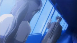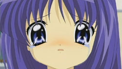 After school ends and he parts ways with Nayuki, who’s feeling better now, Yuuichi finds himself walking through town when he gets tackled from behind by Ayu. She’s still searching for something, but Yuuichi can’t help her today because he wants to get home early. He’s actually quite worried about Makoto, who should have gotten off work by now, and by chance he sees her standing on the sidewalk staring into a game arcade. Specifically, she’s looking at three girls at the purikura machine, which makes Yuuichi wonder if she wants to have her photo taken. Makoto denies it and then heads home with Yuuichi following. Across the street, a girl named Amano Mishio was watching them, but then walks away after they leave. Yuuichi meanwhile asks Makoto about her job, which according to her went fairly easily. After she gets angry at him for not believing her and runs off by herself, Yuuichi turns around and goes the other way to buy a notebook, but he soon realizes that Makoto is still with him, following close behind. When he catches her, she claims have things to do in the same direction that he’s going. Yuuichi finally suggests that they just walk together and so she goes with him.
