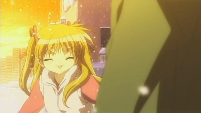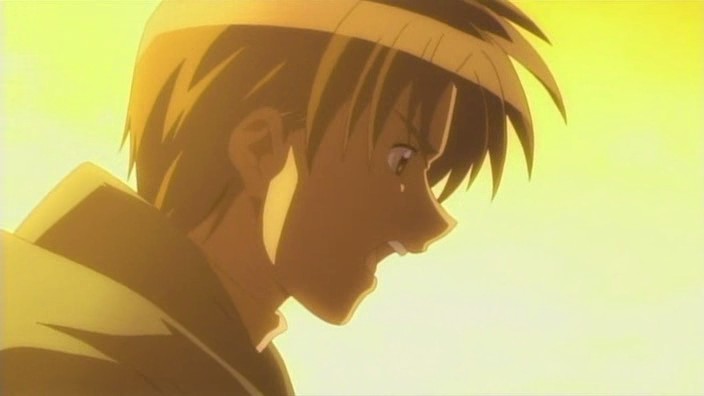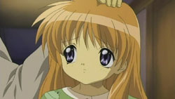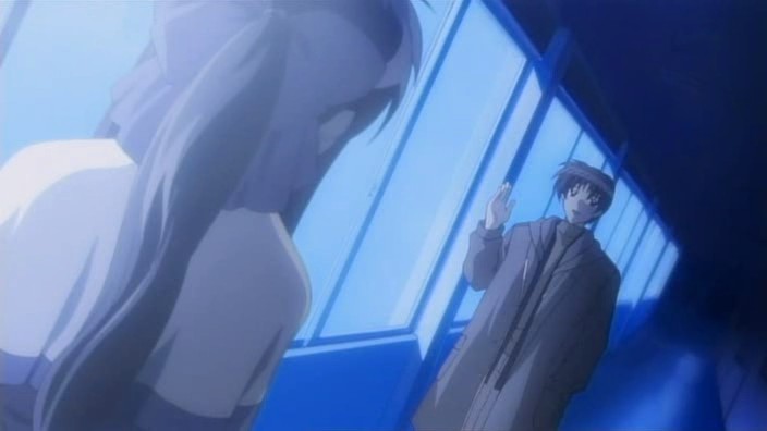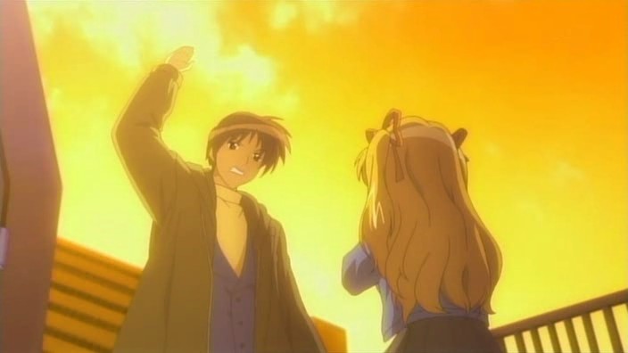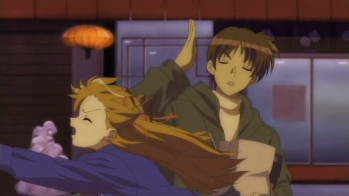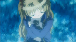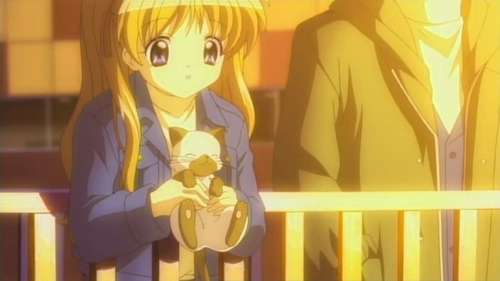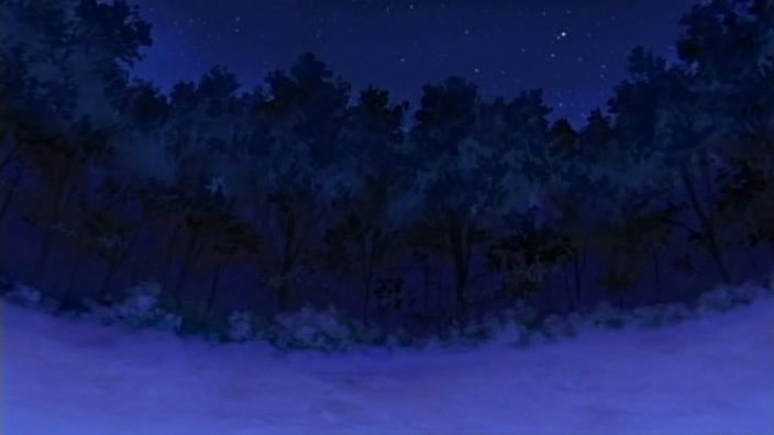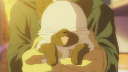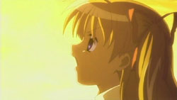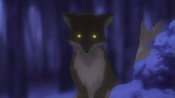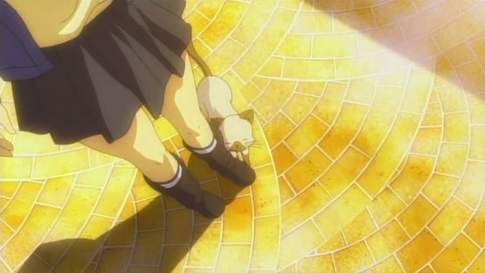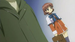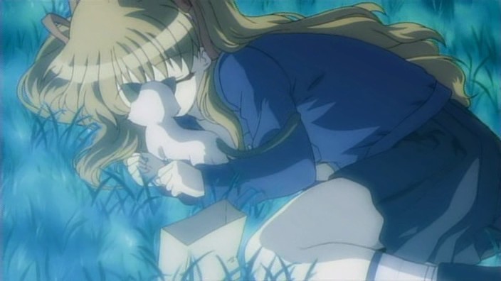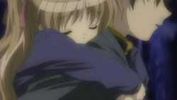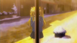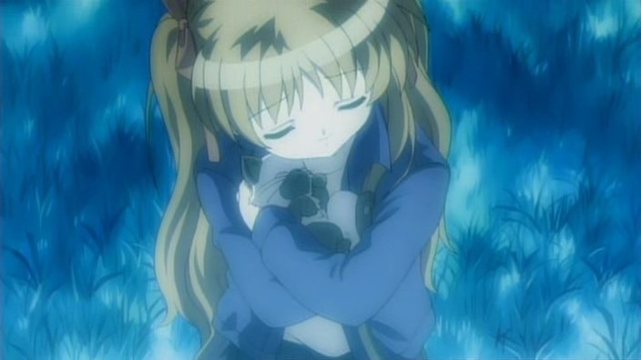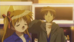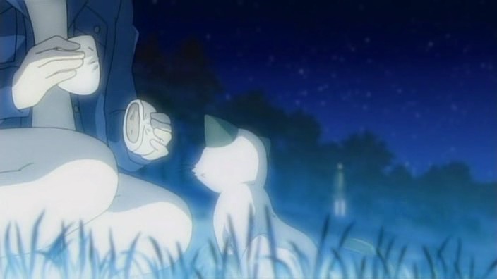 Nayuki worries when Makoto doesn’t show up for dinner that night, but Yuuichi remains pissed off. He eventually goes out and tries to look around for her, but to no success. Realizing that he doesn’t know much about Makoto, he goes to see Mai at school and asks if Makoto has been there. Mai hasn’t seen her, but upon learning that the girl is missing, she suggests Yuuichi go to Monomi Hill. When he asks her why she knows, Mai replies that she merely has a hunch. Following the advice, Yuuichi heads up the hill and does indeed find Makoto there, along with the cat. From a distance, he sees her share a meat bun with it and then sees her then hug it, saying they’re the same because they’re both nuisances with nowhere to go. Makoto is tired from having searched for the cat since that evening, so she falls asleep in the grass. Having heard what she’s been doing all this time, Yuuichi brings the still-sleeping Makoto home, telling her that she’s their family. On the way back down the hill, he notices a kitsune staring at them.