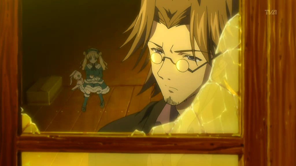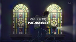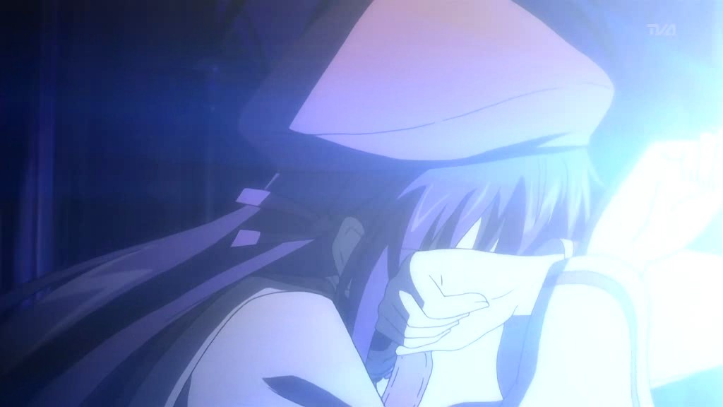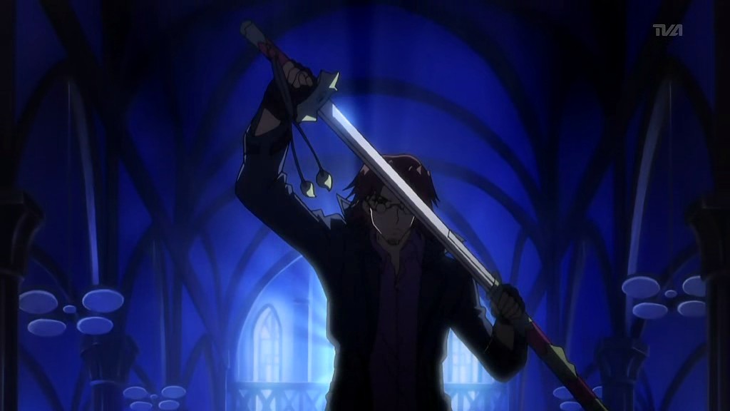 That church is where Matsuri is staying, and on this very night, Matsuri wakes up to hear someone opening the front door. When she goes to check it out, there’s no one there, but when she turns back around, a man appears in the darkness and starts attacking her with dart-like objects that spew bright light. Matsuri manages to dodge the beams and heads for the windows, but the man is prepared with high-powered lights outside shining into the church. He corners Matsuri at the alter and draws his sword, but the entire scene gets interrupted by the arrival of Yorito.