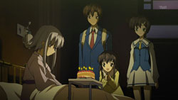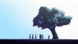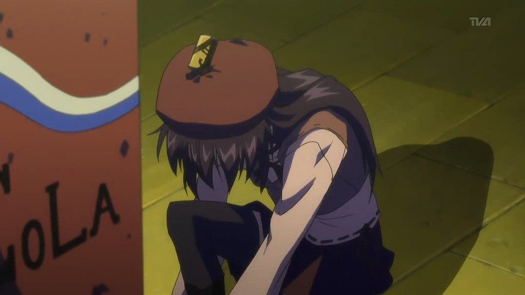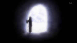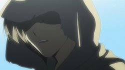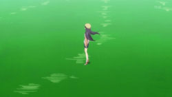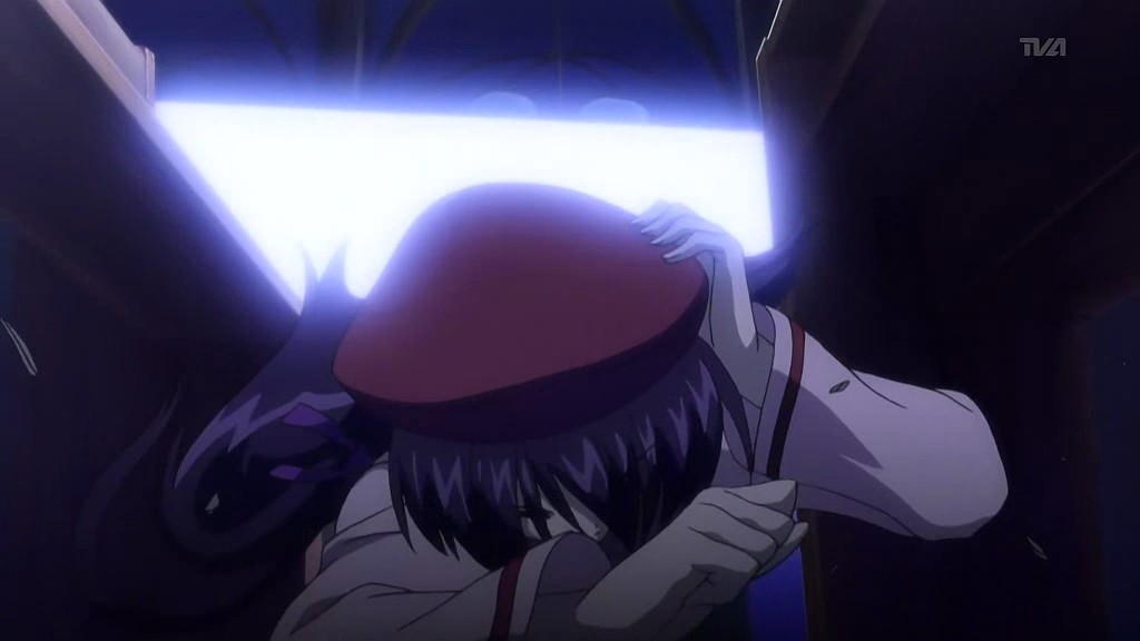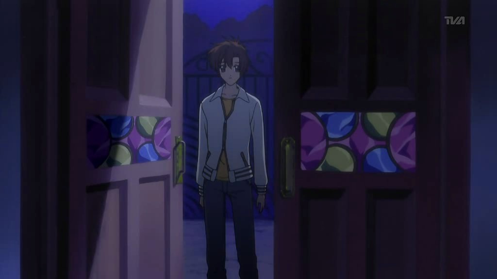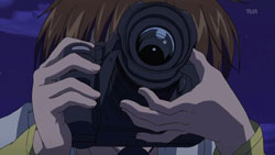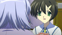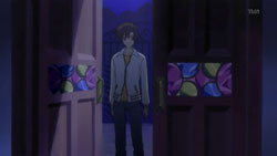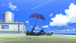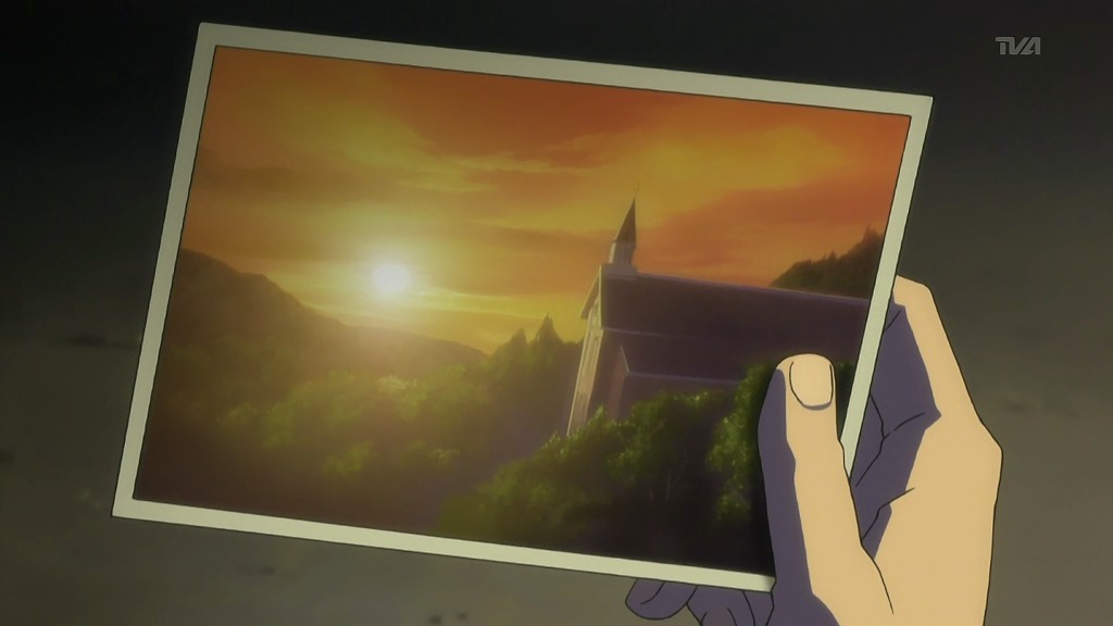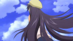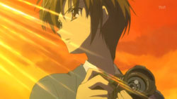After the girl recognizes him, the two return to the vending machine where she attempts to charge to get it to dispense her drink. Yorito manages to get in the way, so she runs right into him instead. When the drink comes out anyway, the two have a good laugh about it. Afterwards, she asks him if he likes the rain, he admits to loving the sky. The girl is very interested in the photos Yorito has taken of the sky and shows him the picture she’s carrying of the sunset with a church in the foreground. Recognizing the rosy clouds in her photo, Yorito proceeds to tell her all about clouds. He then sees the girl standing as if she’s in a green field under a blue sky, and when his sight of her returns to normal, there appears to be a tear running down her face. After thanking him, she turns to go, so Yorito stops her to find out her name. The girl gets him to tell him his name first before she finally introduces herself as Shihou Matsuri. The next day, Yorito remembers how Matsuri looked like she was crying and the photo she had shown him. This reminds him of the photo he had taken before from the roof of the hospital since hers had the same church in the foreground.