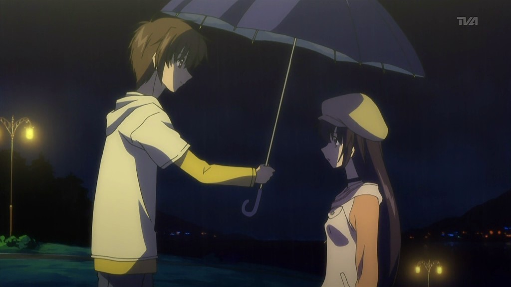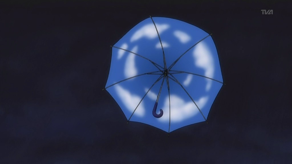 Early one morning, Morimiya Yorito leaves home and bikes to the waterfront so that he can take pictures of the first light of day. While it’s still dark, he notices that there’s a girl nearby kicking a vending machine because it ate her money. Yorito succeeds in getting a drink by kicking the machine, but by the time he does so, the girl is gone and the sun is coming up. Later that day, Yorito heads to the hospital with his friend Ishizuki Mana to bring his older sister Aono a birthday cake and a present. Nevertheless, when Yorito catches sight of the beautiful sunset outside, he races to the rooftop to take a picture of it and manages to get one with the nearby church in the foreground. Mana lectures him about it when they get home because it was his sister’s birthday and Yorito’s the only family Aono has left. She thinks that the sunsets are all the same, but Yorito disagrees because no two skies are the same. He ends up going on an errand for Mana, but on the way back, he gets caught in the rain. Yorito takes refuge by the waterfront near the same vending machine from earlier and by chance happens to see the same girl kicking it again. When a strong wind blows her umbrella away, Yorito notices that the inside of it is painted to look like the sky.
