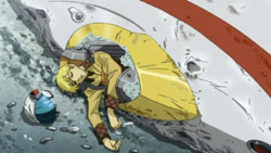 The next morning, the day of his Awakening, Jomy leaves home alone and heads out to the amusement park that he has fond memories of. It is there that he sees a small creature being kept in captivity, but he is shocked when the creature cries out to him. It wants to be let out and wants to return home, but Jomy gets shocked when he tries to touch the glass. One of the men in the crowd realizes that the creature telepathically talked to Jomy and thinks that Jomy must be a Mu. Afterwards, Jomy gets on a roller coaster ride, but it is in the middle of this ride that his Maturity Check begins. Faced with a computer that calls itself Teraz No.5, Jomy is shocked to learn that the first phase is the purging of his memory. Fortunately, before the computer gets very far, a boy arrives to help Jomy and tells him not to relinquish his memory. This boy, who is the same person from Jomy’s dream, introduces himself as Soldier Blue. He attacks the computer and allows Jomy to escape, returning Jomy to the amusement park ride he was on. However the ride leaves the building and crashes outside. Jomy pulls himself out of the wreckage and limps back towards where the creature was. This time, when he reaches his hand towards the glass, the creature breaks free and jumps into his arms. However, Jomy then finds himself face to face with security forces who declare him unfit and are ready to get rid of him.