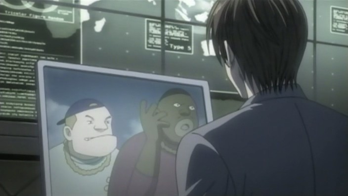 At the same time, Near’s men report the same thing to him, and Near also suspects that Kira is the one who killed the director. He is also curious about the whereabouts of Mello and finds out that there have been no signs of him. Thinking to himself, Near feels that Mello is too emotional and neglects the important things. Back at Light’s apartment, the investigation team gets another call from Mello giving instructions for Souichirou to come to Los Angeles. To prove that Sayu is still alive, Mello transmits an image of her tied up in front of a TV airing a cartoon that’s currently on. Because of this, Souichirou decides to bring the Death Note to L.A. Having come up with a plan, Light calls up the director of the FBI and pretends to be L. He requests their help in investigating the murder of the Japanese police director, but Near then asks for the phone from the FBI director. Near refers to Light as the second L and explains that the SPK are trying to capture Kira without relying on L because they know L is dead. When Near introduces himself as N, Light can’t believe it, but deep down, he is reminded of the real L.