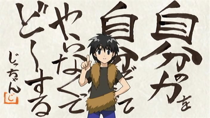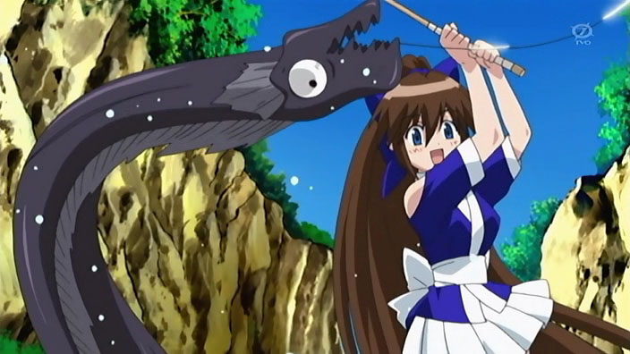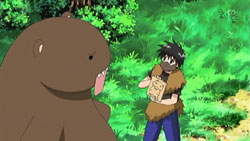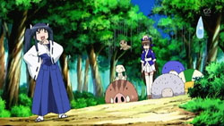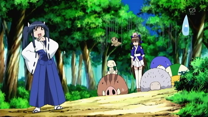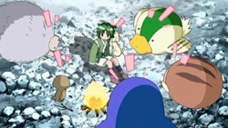 We start out with Ikuto and Suzu fishing at the river for some nasty-looking barracuda fish that are probably rather tasty grilled with some kimchi and natto. Yukino falls out of the sky for no apparent reason and lands on our plucky protagonist. A bunch of roundish animals come of the bushes to check up on Yukino, as Suzu tries to work her CPR magic again. As they warm up around the fire, Tonkatsu sits securely in Suzu’s lap, unaware of her preference for fresh bacon. Ikuto, as sharp as ever, notices that the animals are talking to each other…and to Yukino and Suzu. His eyes go white when he realizes that he’s the only one that can’t understand! The gremlin thing and the roundish wild boar write some Japanese on paper with their calligraphy brushes to translate. Talented bunch, these fingerless creatures…